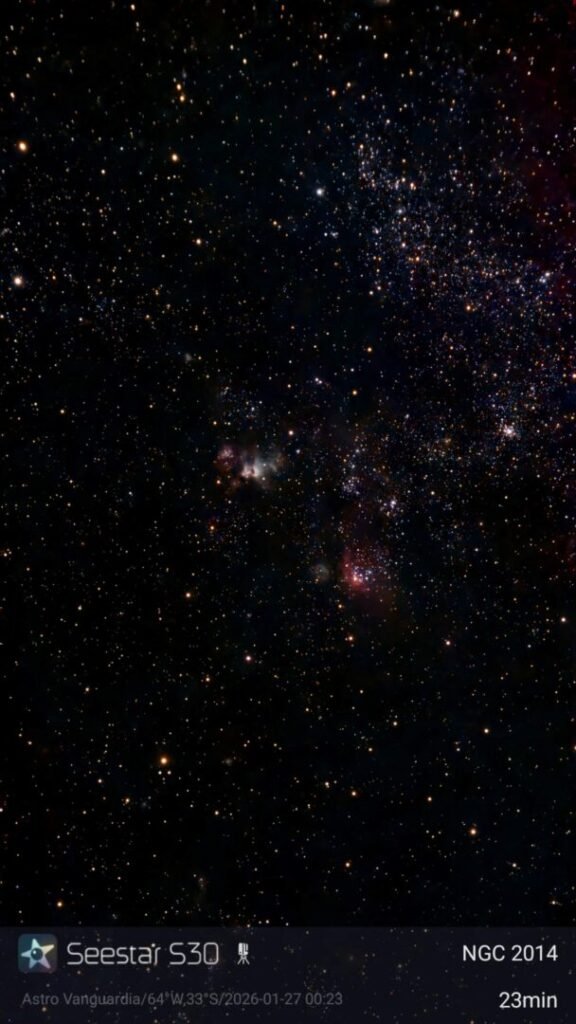 Para la observación visual utilicé el Heritage 130P, mientras que para el cielo profundo recurrí al Seestar S30, con el que capturé dos objetos fascinantes del hemisferio sur: NGC 2014 y NGC 1365.
